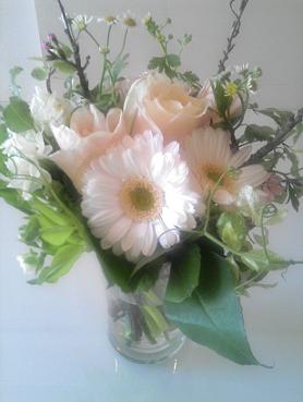 今回の大阪サロンのブーケは、桜にバラ、ガーベラの間をつるのようにくるくると伸びる豆の花が彩る春のブーケ。