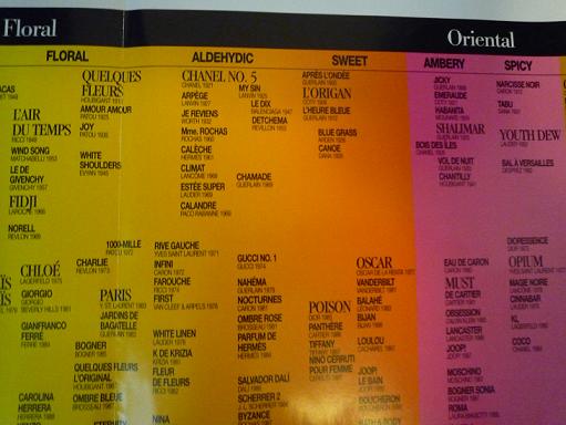 縦の軸が年代になっていて、いつの時代にどの香調が主流で、なかでもどのブランドのどの香水が代表作か判るようになっています。小さい字だけど、見えますか?